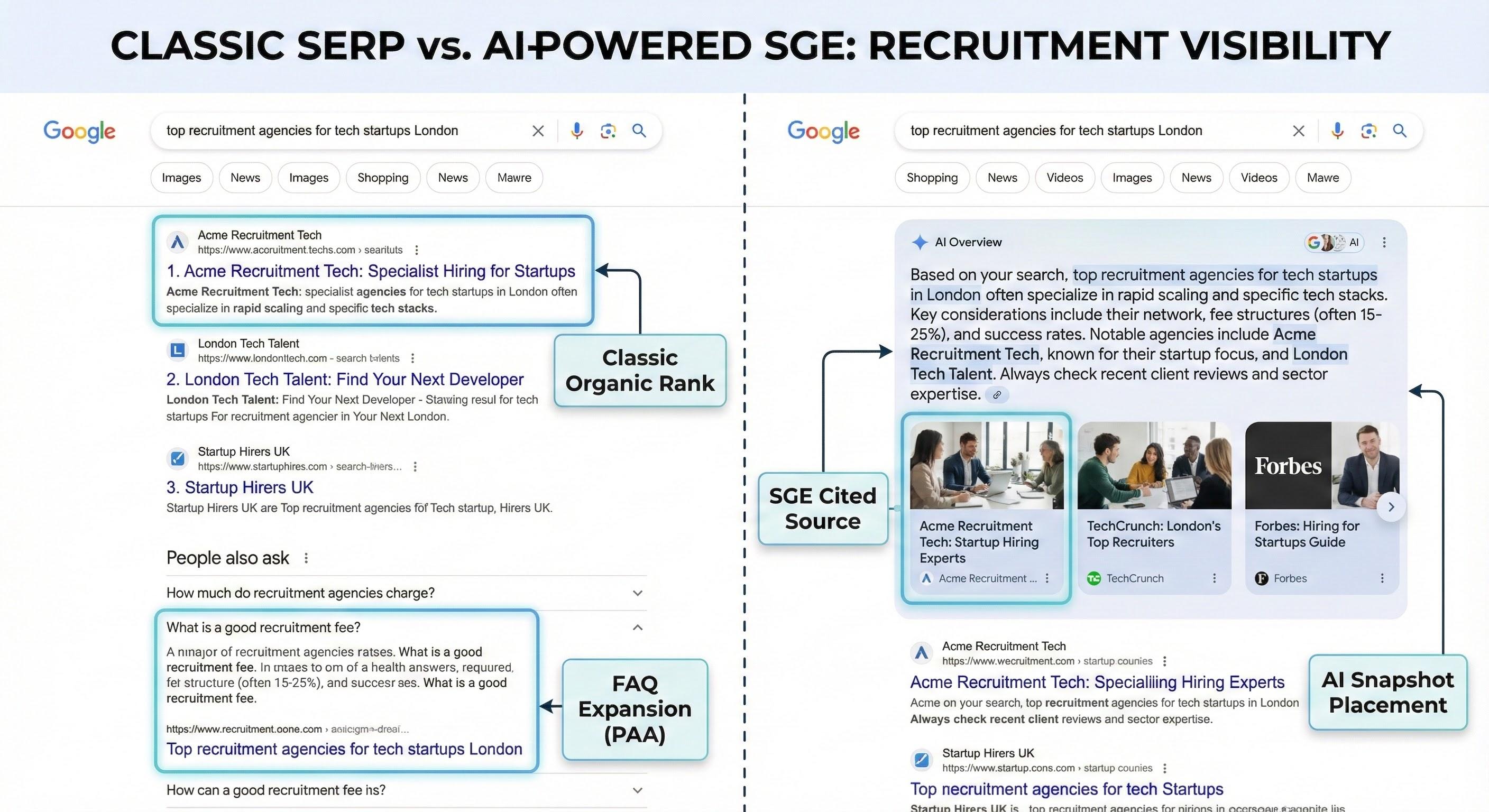 In practice, AI layers like Google’s Search Generative Experience show an AI-generated block that answers the query directly, then cite a handful of sources, often different from the top organic results. For recruitment searches, that means your carefully crafted “IT recruitment agency London” page might still sit in position 3, while SGE answers the query with salary guidance, process explanations, and agency shortlists pulled from other sites. If you do not design your content for extraction, you lose visibility even when you “rank”.