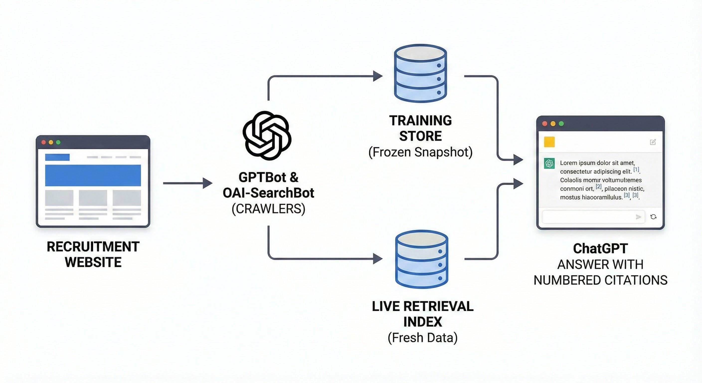 For recruitment agencies, this means your content can influence ChatGPT answers as part of training and as a live, cited source, provided your robots.txt allows the relevant crawlers to access those paths.