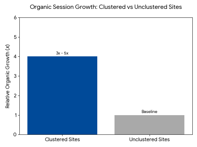 - Topical depth generates 3x to 5x more organic sessions than shallow, scattered content.